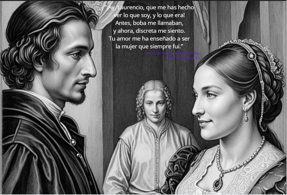 <p>Atribuido a «Lope de Vega (Época dorada, Los hidalgos/villanos)» La imagen muestra tres figuras en estilo renacentista o del Siglo de Oro español: un hombre a la izquierda, una mujer joven en el centro...