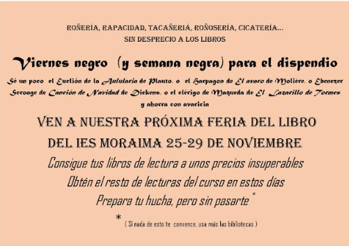 Como ya es habitual en el IES Moraima, la biblioteca promociona de nuevo la lectura: títulos desde 0,50 céntimos, 1, 2, 3, 4 euros; también, por supuesto, fomentamos el trueque de libros. Los próximos martes 2 y miércoles 3 de diciembre (y más días, si hay demanda) abriremos nuestra edición de otoño-invierno.